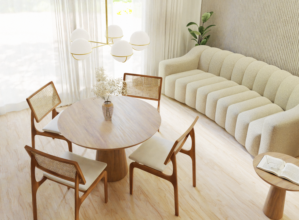 A serene blend of organic textures and mid-century accents, this open-plan space balances warmth and minimalism through sculptural forms and a light, natural palette.